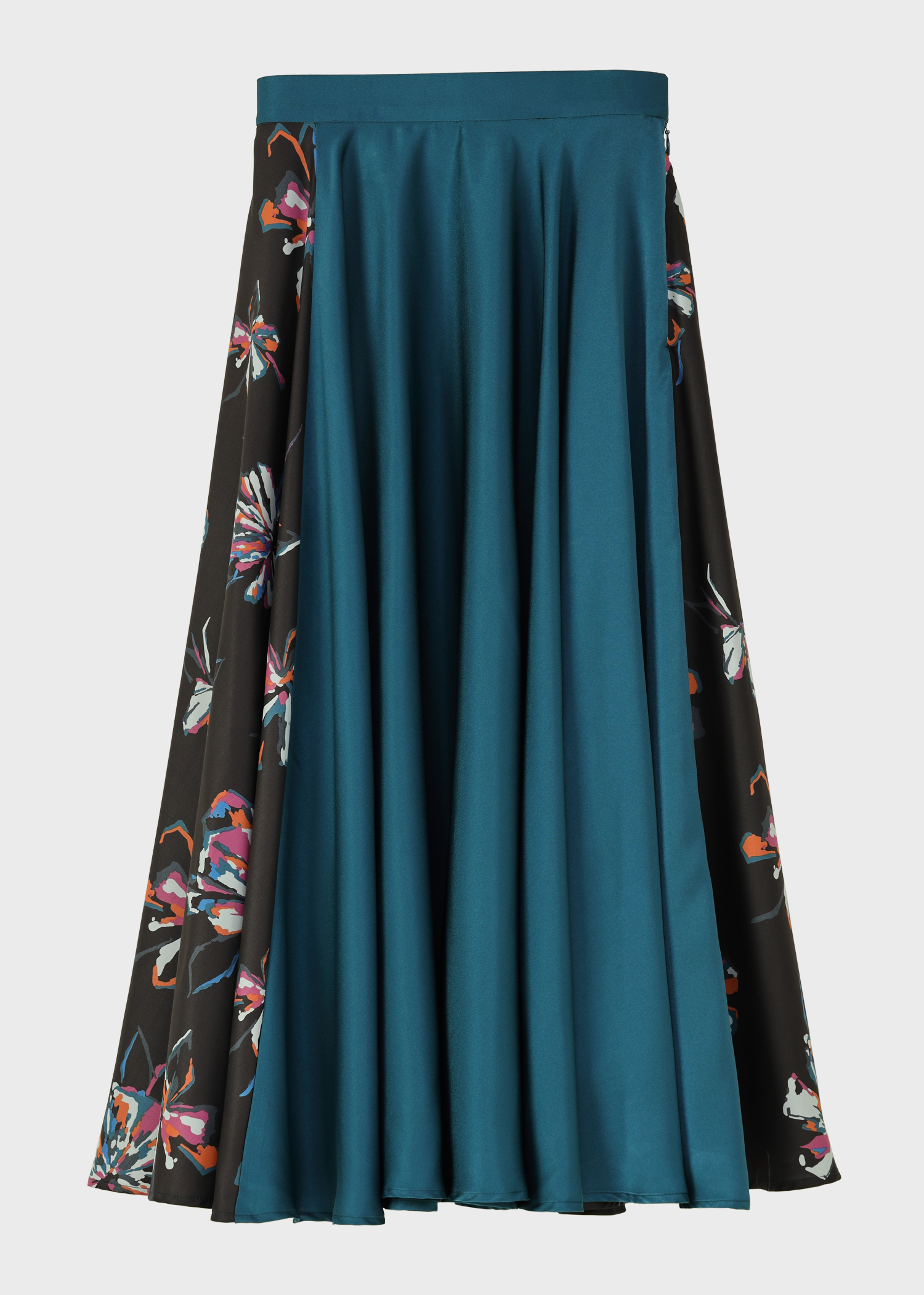 光沢感のあるブルーグリーンの生地の両サイドに、マゼンタピンク・オレンジ・ホワイト・ブルー・ネイビーの色で大柄な花が描かれた墨黒の生地を組み合わせました。
